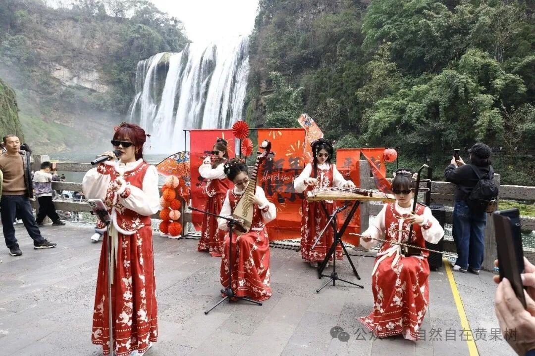 在黄果树瀑布脚下,除了震耳欲聋的水声,还流淌着一股奇妙的律动。特邀前来的国风音乐团队在雄伟的大瀑布脚下,身着华美汉服,琵琶、古筝、笛子、二胡齐鸣,一曲曲极具穿透力的国风曲目化身“山水电音”,古典的雅韵与潮流的热浪在轰鸣的瀑布声中奇妙交融,形成了一种“铁板铜琶唱大江,电音炸裂舞潮头”的独特视听体验。这种打破常规的演出形式,引得过往游客纷纷驻足,举起手机记录下这山水与国潮共鸣的瞬间。