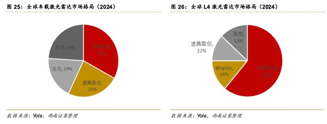 根据东莞证券研报,2024年国内乘用车市场激光雷达标配规模最大的四家供应商依次为速腾聚创(33.6%)、华为(27.4%)、禾赛科技(25.6%)和图达通(13.4%),市场份额总和达99.9%。