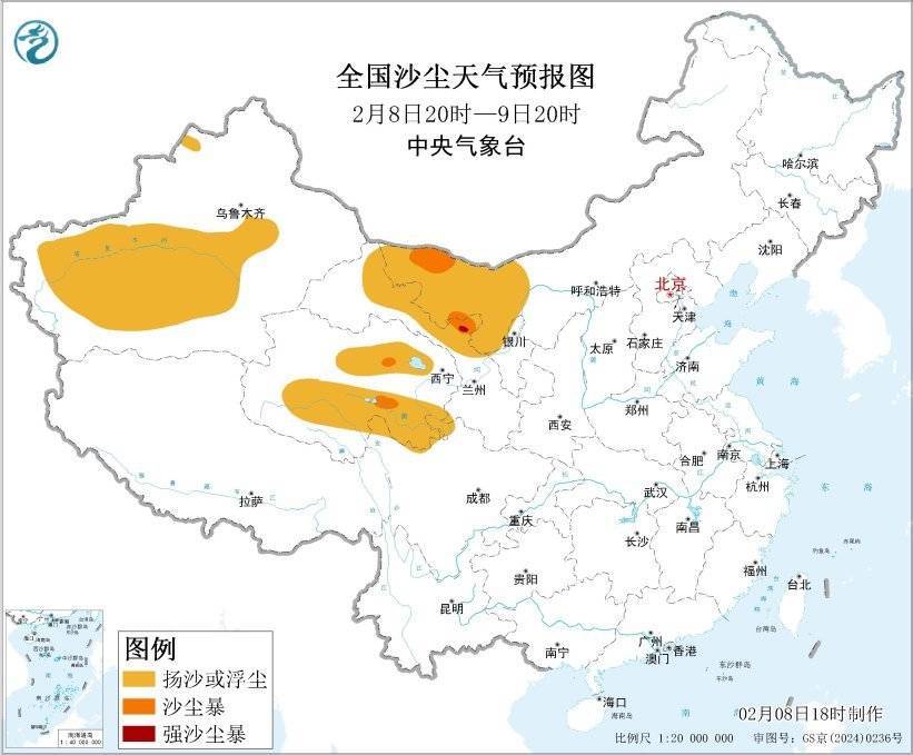 央视网消息:中央气象台2月8日18时发布沙尘暴蓝色预警:受冷空气大风影响,预计2月8日20时至9日20时,新疆南疆盆地、内蒙古西部、甘肃中西部、青海中东部等地的部分地区有扬沙或浮尘天气,局地有沙尘暴或强沙尘暴。