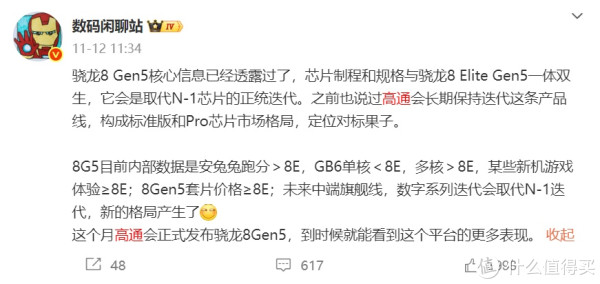 其实高通今年大致想要对标苹果,采用标准版和pro芯片的市场格局,骁龙8 Elite Gen 5就是pro芯片,也是正代顶级旗舰,而骁龙8Gen 5则是标准版,同样是旗舰芯片但定位会低一些,主要用于中端市场的高性能手机上,不过这款骁龙8Gen 5处理器实际上与上代的骁龙8至尊版很接近,跑分应该大致在三百万以上,将会在本月由一加ace系列手机首发搭载。