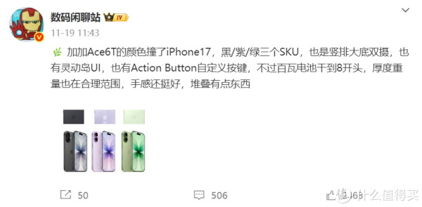 外观和配色似乎有点撞脸iPhone 17了,从博主爆料的外观图来看,这次采用黑、紫、绿三种配色,相机模组也是竖排设计,完全对应上iPhone 17手机了,加上R角设计果味十足。