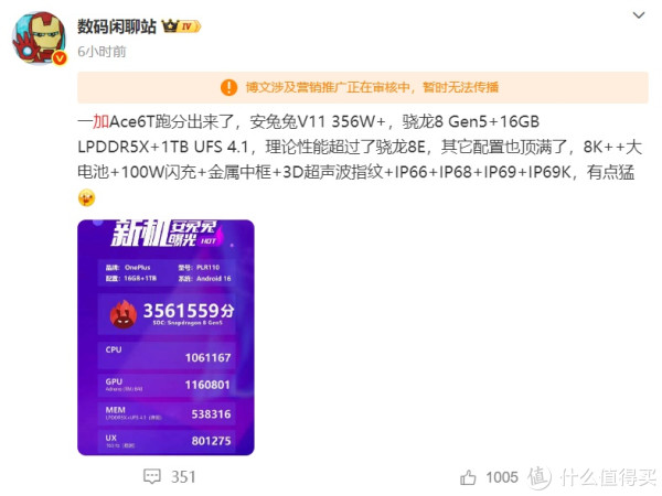 目前官方已经宣布,接下来将用一加ace 6T首发搭载骁龙8Gen 5处理器,目前这款手机的跑分也已经爆出来了,据博主数码闲聊站爆料,一加ace 6T安兔兔V11跑分达到356万,从跑分来看要超过骁龙8至尊版。